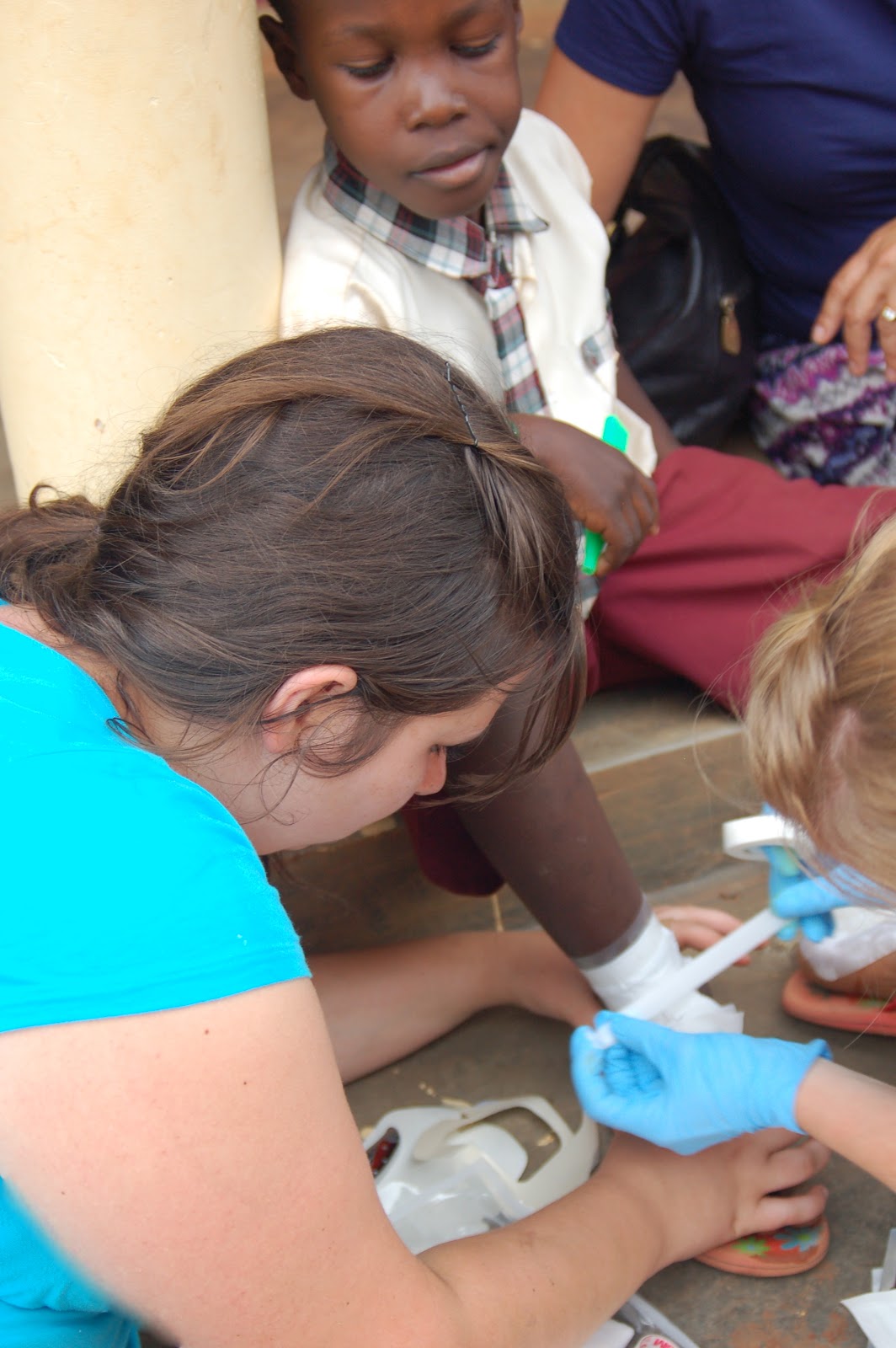 As we were about to leave the VBS, my lovely teammate and friend Alicia {she's a nurse} pulled me to the side and asked for my simple medical stuff that I carried everywhere with me in Africa. {There is such a HUGE need for this kind of stuff; peroxide, antibiotic ointment, bandaids, gauze, etc} I pulled it out and went with her to see the situation. Standing before us was a tiny little boy by the name of Marvin. He had a darling face and eyes that just stole your heart. When I looked down at his legs I realized they were severely burned and left open. Flies were covering them and they were horribly infected. Nurse Alicia with me as an assistant to the rescue! Alicia quickly cleaned, bandaged and prayed over this precious little boy. We discovered that he had been burned by a pot of boiling water while his step mother was cooking. This is common in Africa because they cook over charcoal outside with big pots. It is very unsafe, especially for small children. I was so thankful and realized so much how much need there was for simple first aid. I walked away with a little bit more of a broken heart, but a little bit of encouragement too. God is doing work!